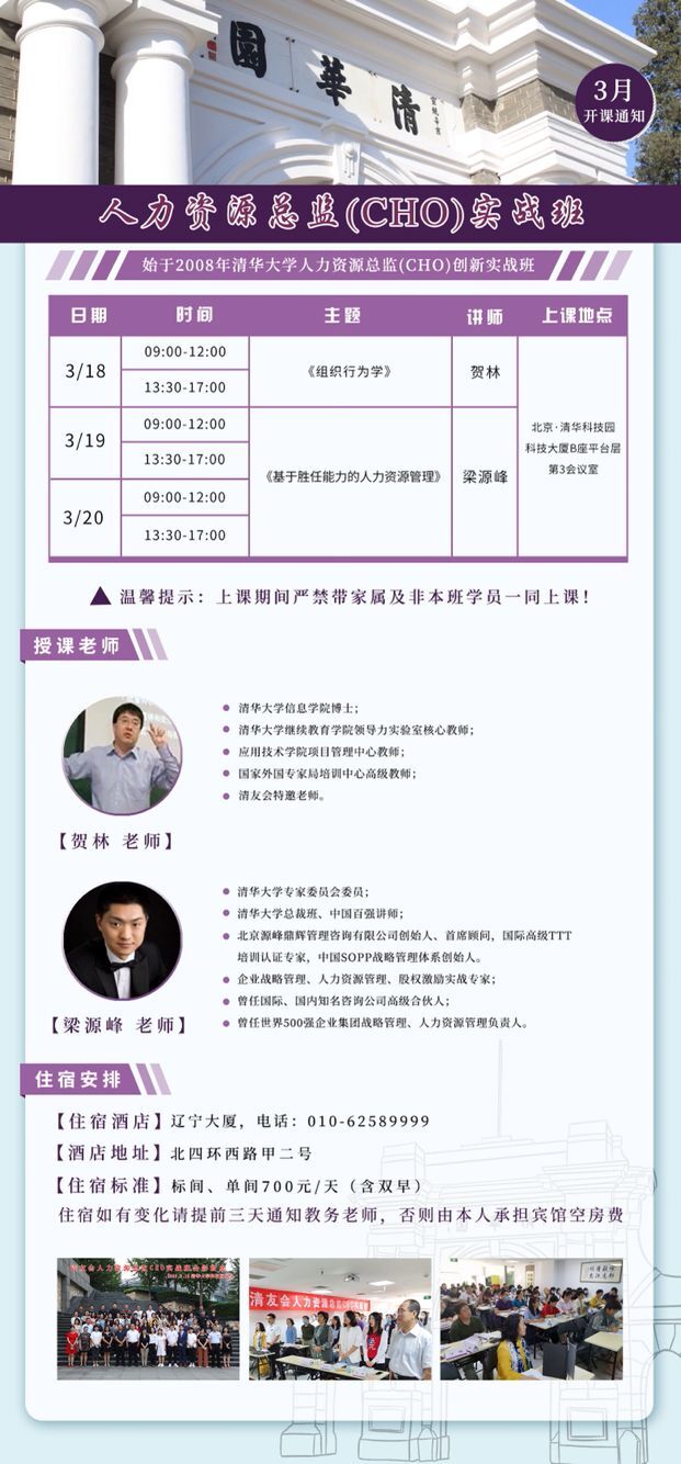2022年3月18-20日人力資源總監(jiān)CHO研修班開課通知 課題:《組織行為學(xué)》、《基于勝任能力的人力資源管理》 授課老師:賀林、梁源峰 上課地點:清華大學(xué)科技園 課程全稱:人力資源總監(jiān)(CHO)創(chuàng)新實戰(zhàn)高級研修班 學(xué)習(xí)費用:29800元 |