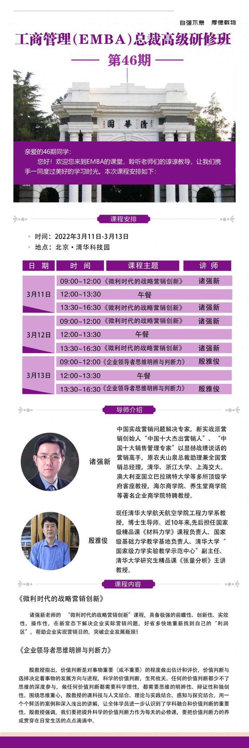 2022年3月11-13日工商管理EMBA總裁研修班開課通知 課程主題:《微利時代的戰(zhàn)略營銷創(chuàng)新》、《企業(yè)領(lǐng)導(dǎo)者思維明辯與判斷力》 授課老師:諸強新、殷雅俊 上課地點:清華科技園 課程全稱:工商管理EMBA總裁高級研修班 |