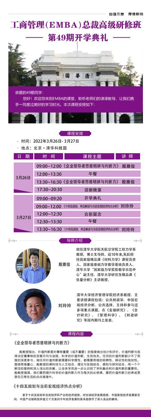 2022年3月26-27日工商管理EMBA總裁班49期開學(xué)典禮 授課主題:《企業(yè)領(lǐng)導(dǎo)者思維明辯與判斷力》、《十四五規(guī)劃、兩會(huì)解讀與當(dāng)前宏觀經(jīng)濟(jì)熱點(diǎn)分析》 授課老師:殷雅俊、劉玲玲 上課地點(diǎn):清華科技園 課程名稱:工商管理EMBA總裁研修班 |