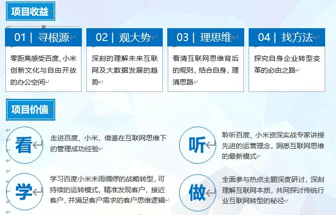 讓我們一起走進(jìn)國(guó)內(nèi)最優(yōu)秀的互聯(lián)網(wǎng)企業(yè):百度和小米,在這里你可獲得瞬間引爆全局的影響力,為您的企業(yè)找到可快速融合的生態(tài)化價(jià)值系統(tǒng);還可為您的企業(yè)進(jìn)行互聯(lián)網(wǎng)化的轉(zhuǎn)型與升級(jí)指點(diǎn)迷津