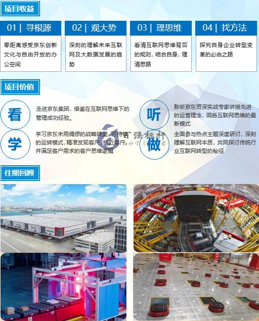 8:30-9:30 | 巴士課堂 巴士課堂標(biāo)桿學(xué)習(xí)行前引導(dǎo),隨團(tuán)顧問介紹本次學(xué)習(xí)重點(diǎn),引導(dǎo)大家對京東物流創(chuàng)新模式與京東戰(zhàn)略布局的思考。 |