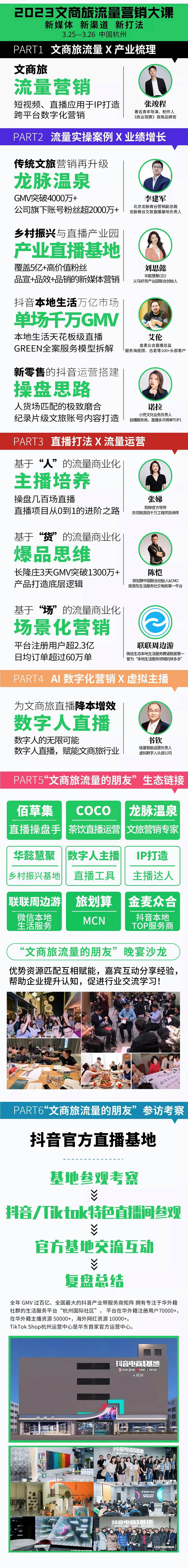 | 課程簡介: | 文商旅流量X產(chǎn)業(yè)梳理、流量實(shí)操案例 X 業(yè)績增長、直播打法 X 流量運(yùn)營、AI 數(shù)字化營銷 X 虛擬主播、“文商旅流量的朋友”生態(tài)鏈接、“文商旅流量的朋友”參訪考察 | ||