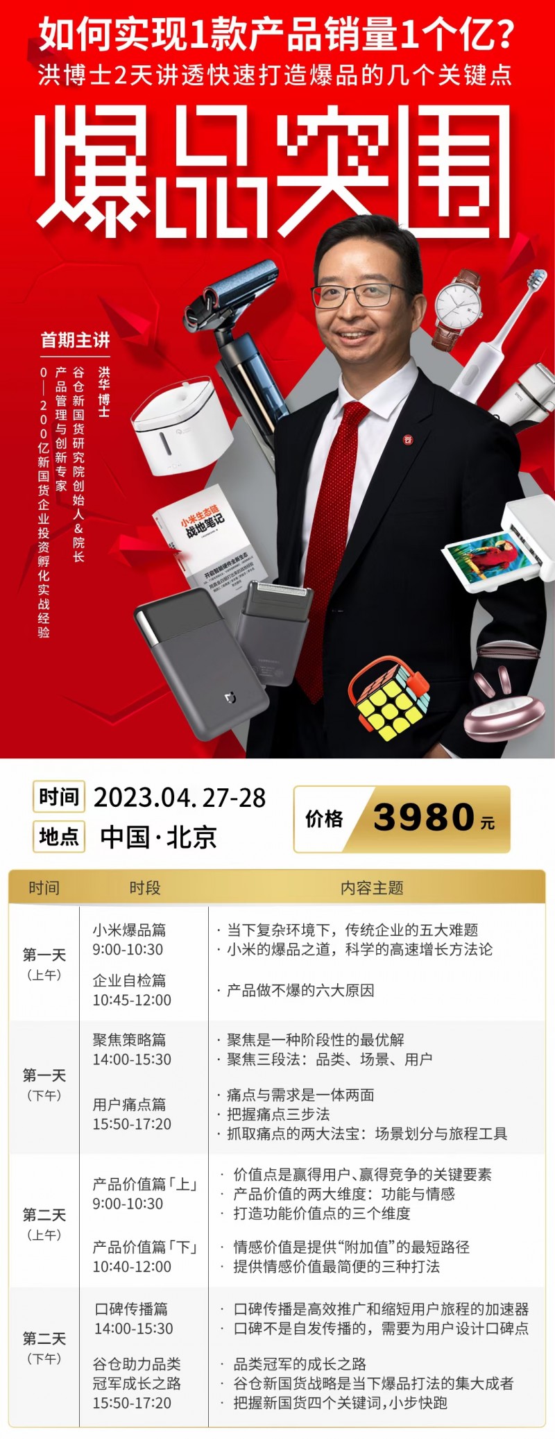 | 課程簡介: | 如何實(shí)現(xiàn)1款產(chǎn)品銷量1個(gè)億?洪博士2天講透快速打造爆品的幾個(gè)關(guān)鍵點(diǎn)。 | ||