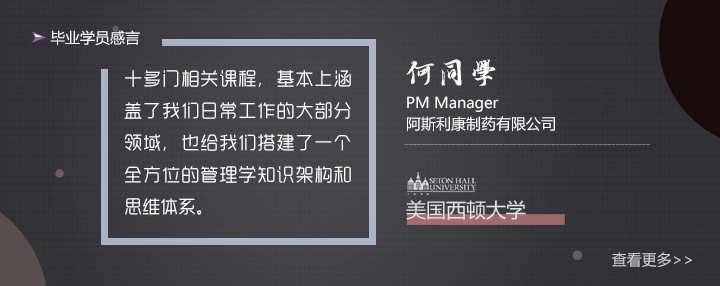 西頓課程設置 1 財務會計 必修 2 公司金融 3 營銷管理 4 企業(yè)倫理 5 戰(zhàn)略管理 6 供應鏈管理 7 國際商務 8 中國宏觀經濟分析 9 組織行為學 10 商法 選修 11 項目管理 12 領導力 13 變革管理 14 創(chuàng)新管理 外教 備注:選修課可能會有1-2門變動,將依據課程綜合評價調整更新 授課方式▼ 采用面授、案例分析與研討、實戰(zhàn)模擬等多元化方式。為了保證課程的前瞻性及畢業(yè)設計實踐性課題的研究,美國西頓大學MBA課程實施三聯導師制度,三聯導師由美方教師、中方教師和企業(yè)家組成,負責畢業(yè)設計的指導與答辯。 學制2年(以實際情況為準),每月集中面授一次,周六和周日 學員需修滿42學分,完成小組碩士學位論文并通過答辯。 部分校友企業(yè)名錄 畢業(yè)校友感言 報讀條件▼ (1)本科學歷申請:☆經本校認可之國內外大學本科或以上學歷; (2)??茖W歷申請:☆經本校認可之國內外大學專科或以上資歷,并報由學校批準者; 畢業(yè)條件▼ 1.修完規(guī)定課程、考試成績合格、修完規(guī)定學分; 2.完成小組碩士學位論文、論文和答辯通過。 申請材料▼ ①身份證原件掃描件 ②畢業(yè)證及成績單原件掃描件 ③證件照 ④個人簡歷 ⑤推薦表 ⑥個人陳述 項目費用▼ 項目費用為125200元 (其中包括注冊費、講義費、學費和論文指導費,但不包含翻譯費、去本校參加畢業(yè)典禮差旅費、簽證費、食宿費等自理費用)