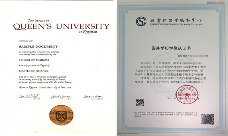 (圖例:左,2013年加拿大女王大學(xué)頒發(fā)證書;右,2018年中國(guó)教育部留學(xué)服務(wù)中心認(rèn)證證書)