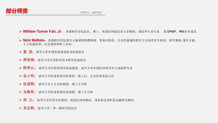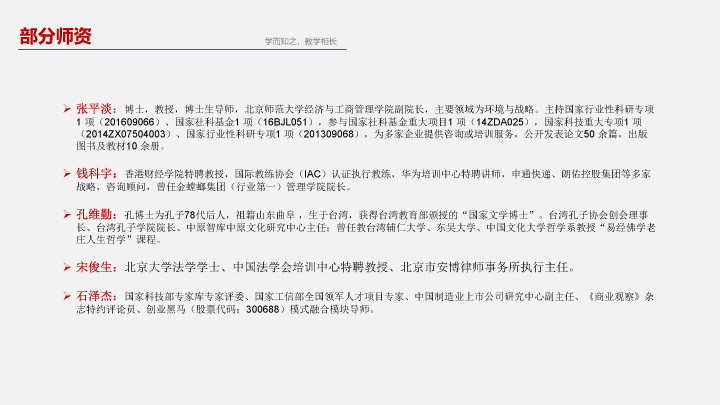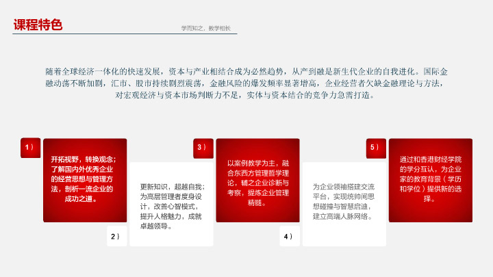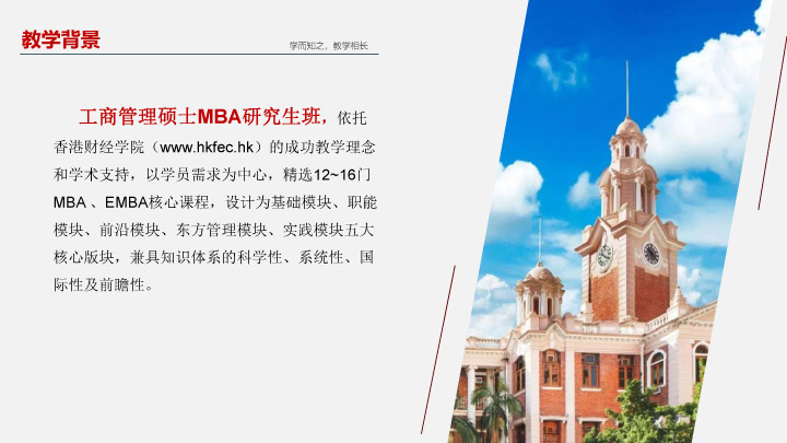 | 課程簡介: | 工商管理碩士MBA研究生班,依托香港財經(jīng)學(xué)院(www.hkfec.hk)的成功教學(xué)理念和學(xué)術(shù)支持,以學(xué)員需求為中心,精選12~16門MBA 、EMBA核心課程,設(shè)計為基礎(chǔ)模塊、職能模塊、前沿模塊、東方管理模塊、實踐模塊五大核心版塊,兼具知識體系的科學(xué)性、系統(tǒng)性、國際性及前瞻性。 | |