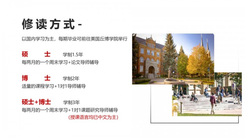 | 學(xué)制安排: | 學(xué)制1.5年 每兩月的一個周末學(xué)習(xí)+論文導(dǎo)師輔導(dǎo) | |