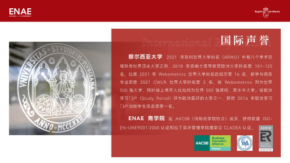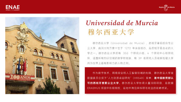 | 課程簡介: | 作為數(shù)字技術、網(wǎng)絡安全和人工智能領域的先鋒,穆爾西亞大學被歐盟委員會授予“人力資源卓越研究”(HRS4R)獎章,是中國教育部認可的西班牙重要公立大學。穆爾西亞大學協(xié)調(diào)大量國際項目,是歐盟ERASMUS 項目中積極院校,是地中海沿岸科研與商業(yè)的戰(zhàn)略橋梁。 | |