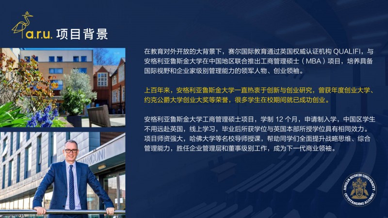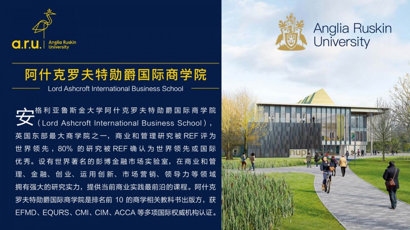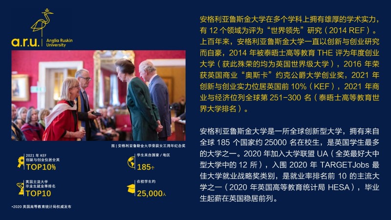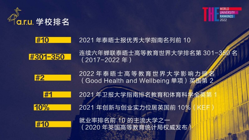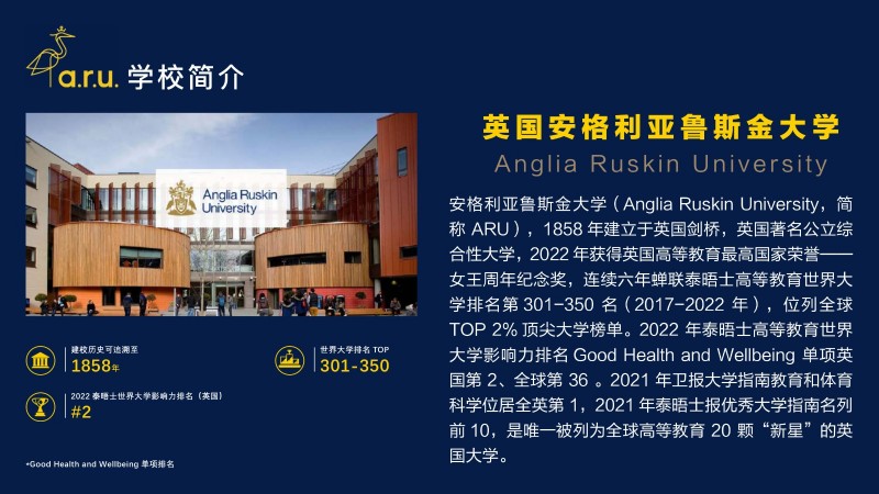 | 課程簡介: | 安格利亞魯斯金大學(Anglia Ruskin University,簡稱 ARU),1858 年建立于英國劍橋,英國著名公立綜合性大學,2022 年獲得英國高等教育最高國家榮譽——女王周年紀念獎,連續(xù)六年蟬聯(lián)泰晤士高等教育世界大學排名第 301-350 名(2017-2022 年),位列全球TOP 2% 頂尖大學榜單。2022 年泰晤士高等教育世界大學影響力排名 Good Health and Welleing 單項英國第 2、全球第 36 。2021 年衛(wèi)報大學指南教育和體育科學位居全英第 1,202 | |