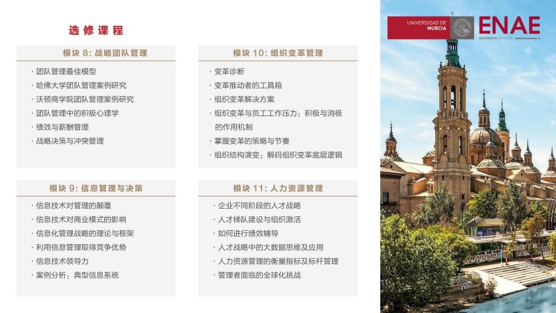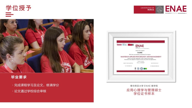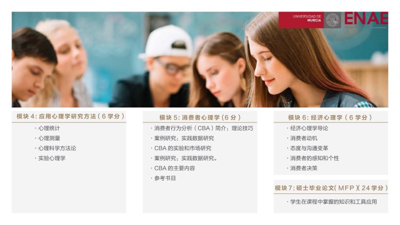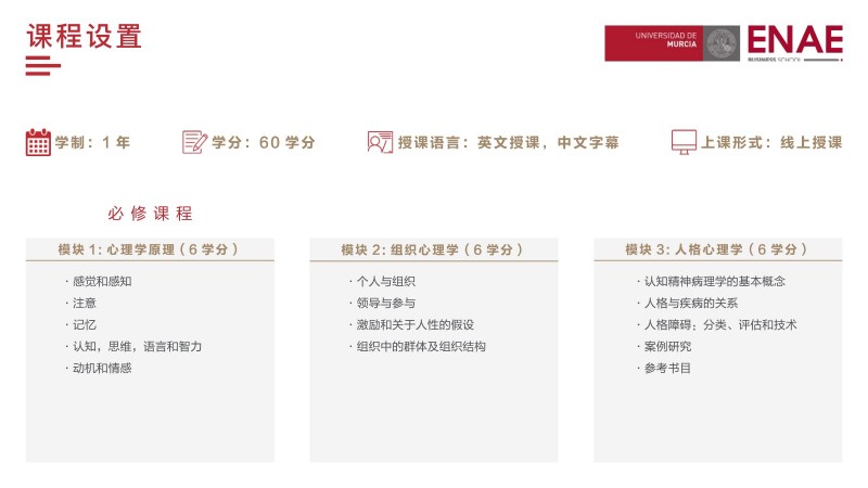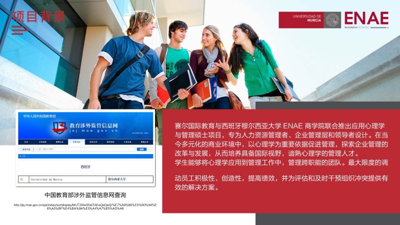 | 課程簡(jiǎn)介: | 西班牙穆?tīng)栁鱽喆髮W(xué)ENAE商學(xué)院的應(yīng)用心理學(xué)與管理碩士課程是面向想要在管理和心理學(xué)領(lǐng)域獲得專(zhuān)業(yè)知識(shí)的職場(chǎng)人士。應(yīng)用心理學(xué)與管理學(xué)的結(jié)合,挑戰(zhàn)高薪管理崗位。該課程將心理學(xué)與管理學(xué)相結(jié)合,使學(xué)生能夠更好地理解人類(lèi)行為和組織管理,從而更好地應(yīng)對(duì)復(fù)雜的的管理挑戰(zhàn)。這種組合也使得學(xué)生在就業(yè)市場(chǎng)上具有更強(qiáng)的競(jìng)爭(zhēng)力,能夠更容易地獲得高薪管理崗位。 | |