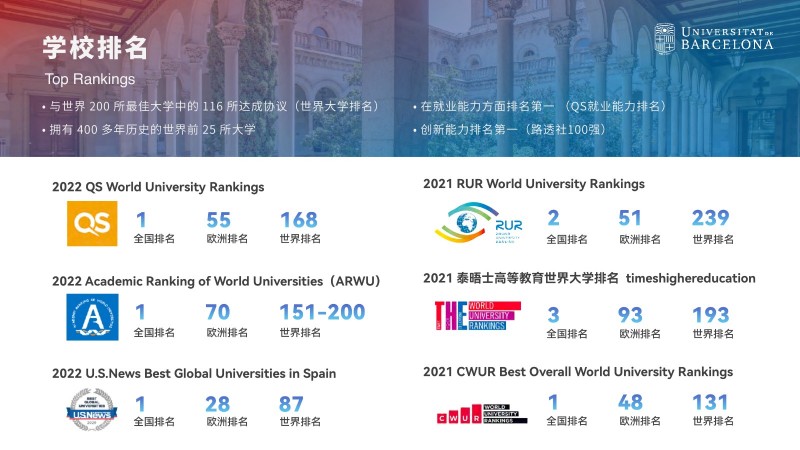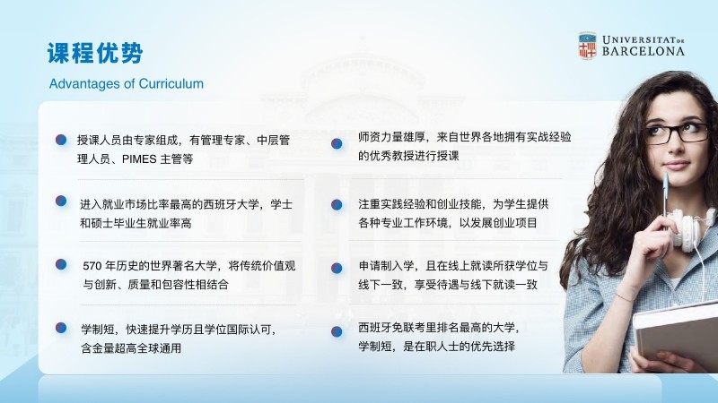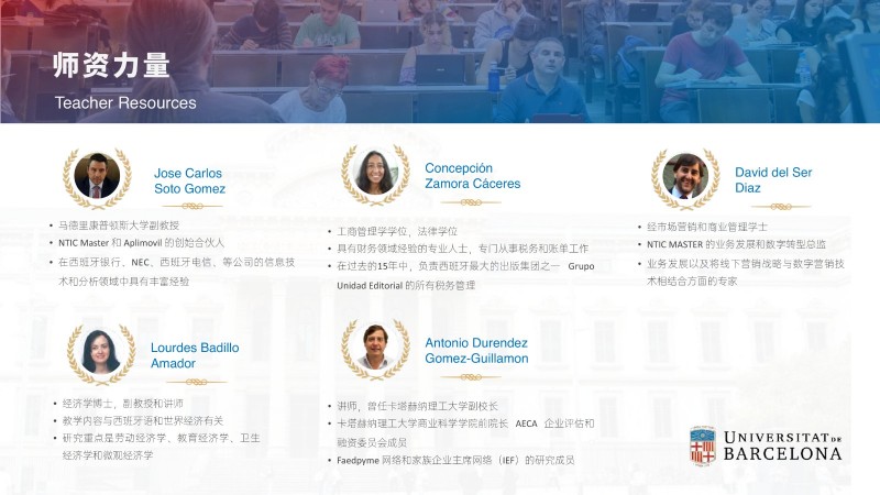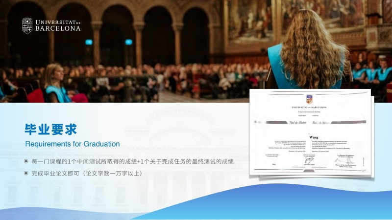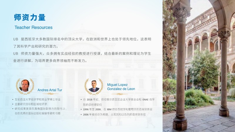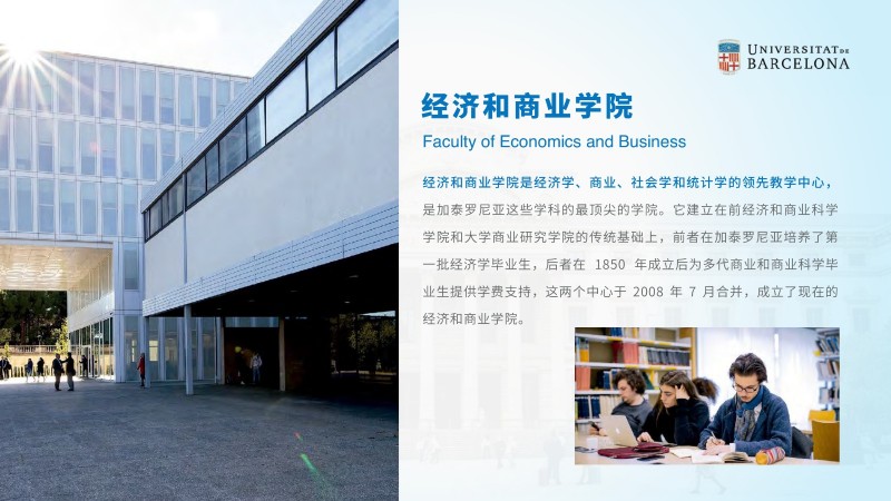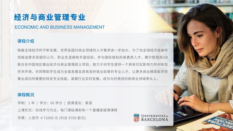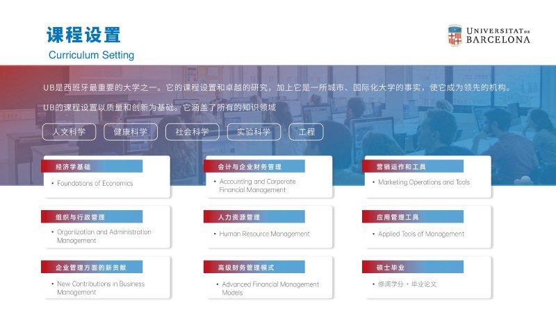 | 課程簡介: | 巴塞羅那大學吸引了來自世界各地的國際學生和教師,為學生提供了與來自不同文化背景的同學合作學習的機會。這種多樣性有助于培養(yǎng)跨文化溝通和合作能力,為畢業(yè)生提供更廣闊的就業(yè)機會。 多樣化的課程設置:經(jīng)濟與商業(yè)管理碩士課程涵蓋了多個方面的知識,包括經(jīng)濟學、金融學、市場營銷、戰(zhàn)略管理等。學生可以根據(jù)自己的興趣和職業(yè)目標選擇專業(yè)方向,并參與實踐項目和案例研究,提高實際問題解決能力。 | |