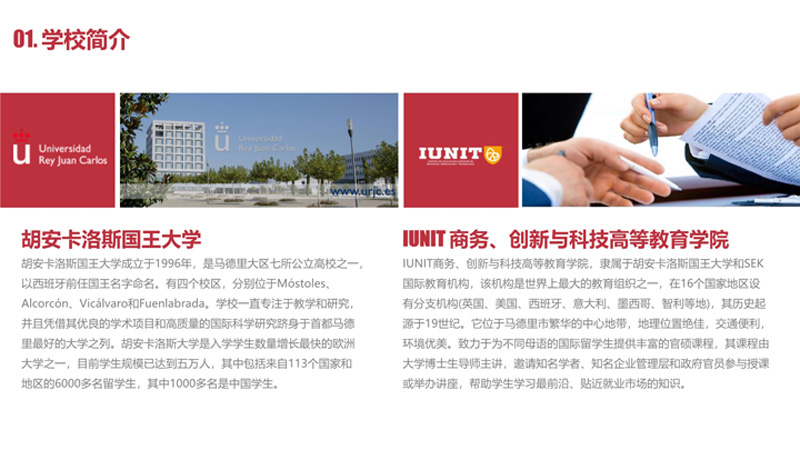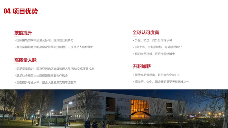 | 課程簡介: | 坐落于西班牙首都馬德里的胡安卡洛斯國王大學(xué)IUNIT學(xué)院,提供面向全球的工商管理碩士項目。該項目旨在培養(yǎng)兼具國際視野與創(chuàng)新精神的復(fù)合型管理人才。課程設(shè)置緊跟數(shù)字經(jīng)濟(jì)浪潮,涵蓋電子商務(wù)、數(shù)字營銷、項目管理及領(lǐng)導(dǎo)力發(fā)展等前沿領(lǐng)域。學(xué)院采用雙語授課并配備中文助教,以強(qiáng)大的師資團(tuán)隊與實戰(zhàn)導(dǎo)向的教學(xué)模式,幫助學(xué)員掌握應(yīng)對全球化商業(yè)挑戰(zhàn)的核心能力。作為歐洲學(xué)分轉(zhuǎn)換體系成員,其官方碩士學(xué)位亦受中國教育部認(rèn)可,為學(xué)員的職業(yè)發(fā)展與國際化拓展提供了堅實平臺。 | |