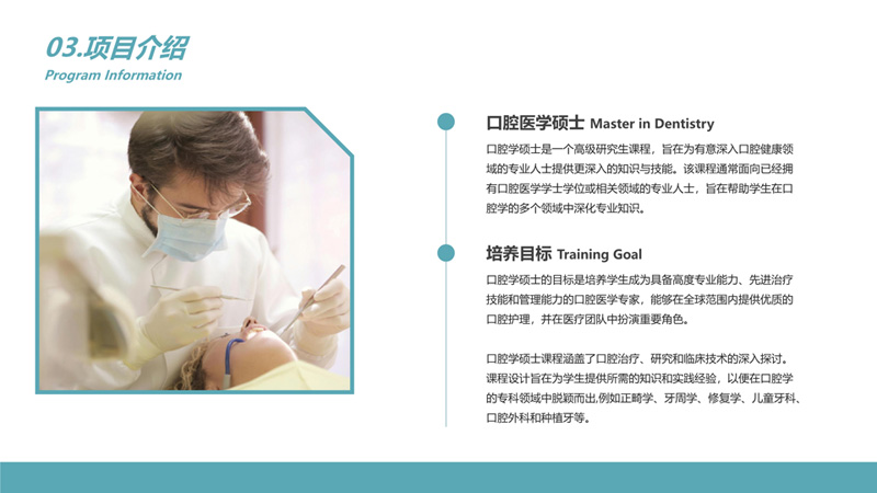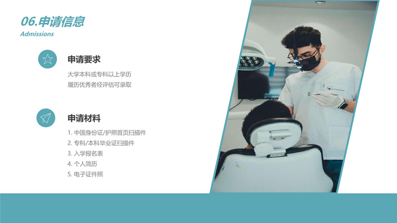 | 課程簡介: | 胡安卡洛斯國王大學(xué)IUNIT學(xué)院口腔醫(yī)學(xué)碩士項(xiàng)目,致力于培養(yǎng)掌握國際前沿口腔醫(yī)學(xué)理論、具備卓越臨床技能與科研創(chuàng)新能力的專業(yè)人才。項(xiàng)目課程深度融合口腔疾病診斷、先進(jìn)治療技術(shù)、口腔材料學(xué)及口腔公共衛(wèi)生管理等核心領(lǐng)域,注重臨床實(shí)踐與學(xué)術(shù)研究的平衡發(fā)展。依托西班牙優(yōu)質(zhì)的醫(yī)療教育資源與IUNIT學(xué)院的國際化平臺(tái),該項(xiàng)目旨在提升學(xué)生在復(fù)雜口腔健康領(lǐng)域的綜合解決能力與職業(yè)領(lǐng)導(dǎo)力。作為官方碩士學(xué)位,它為口腔醫(yī)學(xué)從業(yè)者及畢業(yè)生提供了深化專業(yè)學(xué)識(shí)、拓寬國際視野、加速職業(yè)進(jìn)階的高價(jià)值選擇。 | |