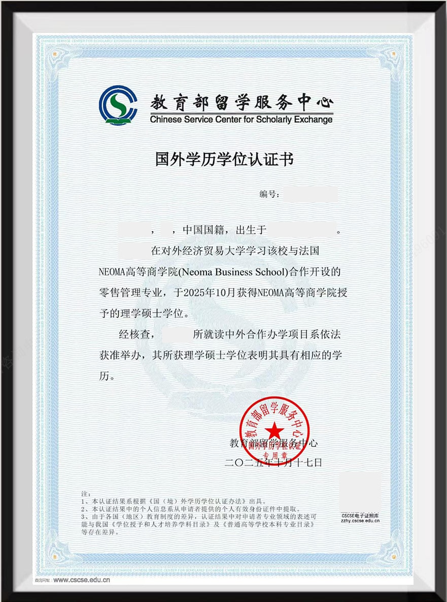 學(xué)員通過全部課程、完成畢業(yè)論文和答辯,經(jīng)過法國諾歐商學(xué)院畢業(yè)評審委員會審議通過后,可獲得由法國諾歐商學(xué)院頒發(fā)的零售管理理學(xué)碩士學(xué)位證書(中華人民共和國教育部認(rèn)可),同時獲得對外經(jīng)濟(jì)貿(mào)易大學(xué)頒發(fā)的零售管理碩士項(xiàng)目結(jié)業(yè)證書。