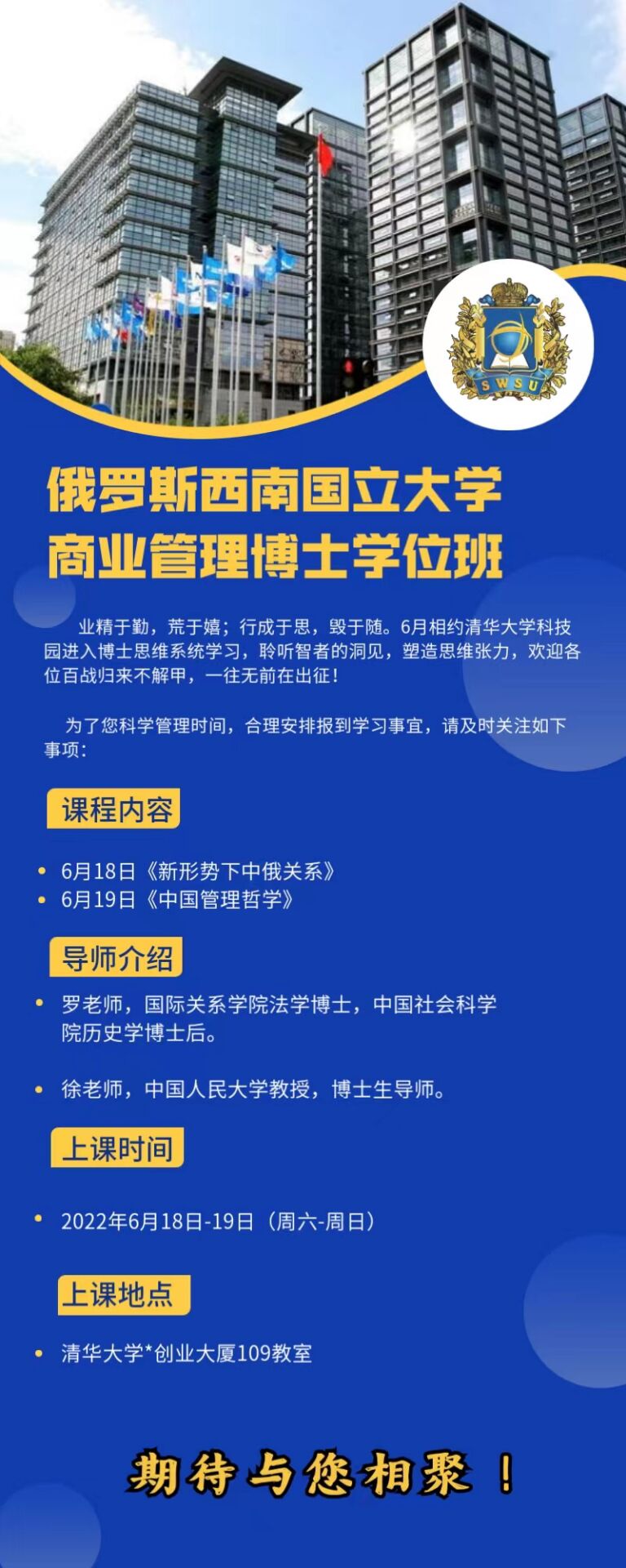 核心提示:俄羅斯西南國立大學(xué)商業(yè)管理博士學(xué)位班| 6月通知業(yè)精于勤,荒于嬉;行成于思,毀于隨。6月相約清華大學(xué)科技園進(jìn)入博士思維系統(tǒng)學(xué)習(xí),聆聽智者的洞見,塑造思維張力,歡迎各位百戰(zhàn)歸來不解甲,