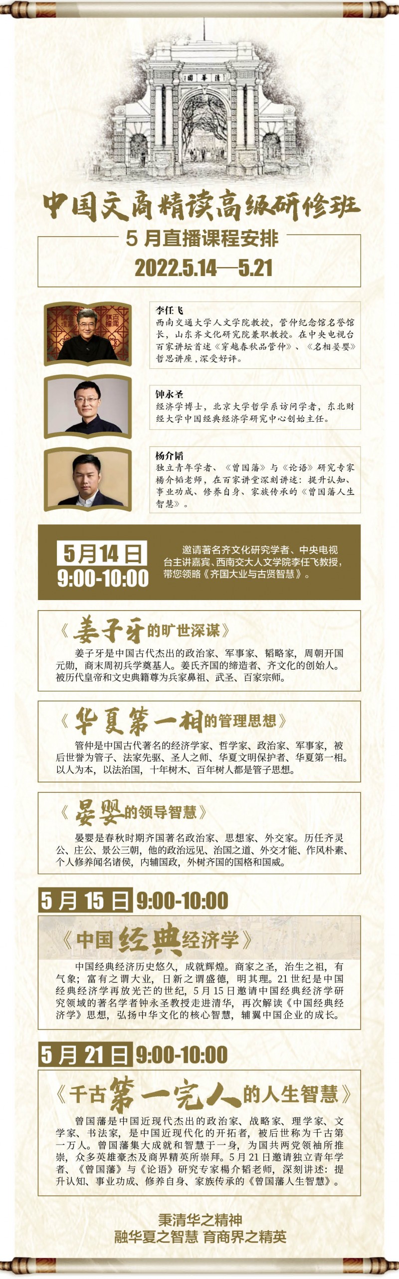 歡迎走進(jìn)清華管理進(jìn)階的殿堂、商界精英的搖籃—第五期《中國文商精讀高研班》與名師為友,與未來同行!