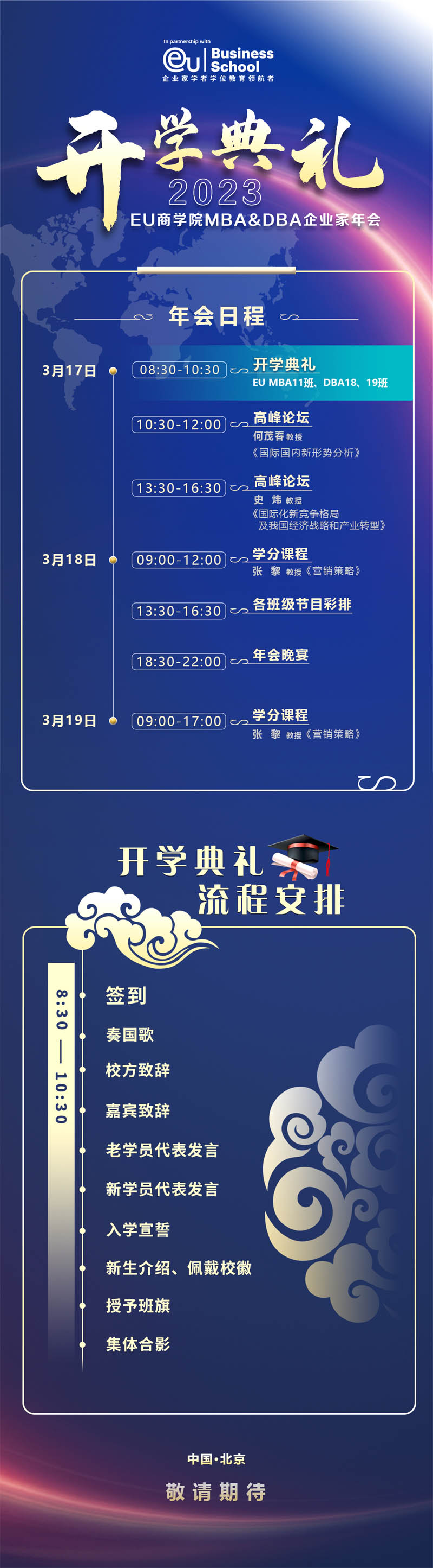 核心提示:EU商學(xué)院MBADBA2023年企業(yè)家年會(huì)開學(xué)典禮年會(huì)日程:3月17日08:30-10:30 開學(xué)典禮EU MBA11班、DBA18、19班10:30-12:00 高峰論壇 何茂春教授《國際國內(nèi)新形勢分析》13:30-16:30 高峰論壇 史 煒 教