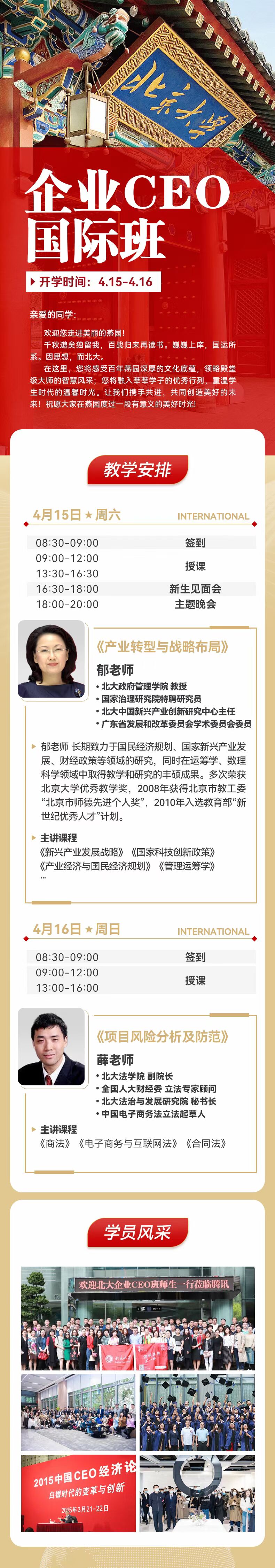 企業(yè)CEO國際班 ▏原北大企業(yè)CEO研修班,二十余年的企業(yè)管理旗艦課程。結(jié)合國際前沿管理理念和中國企業(yè)管理最新實踐,秉承北大悠久的人文傳統(tǒng)、深邃的學(xué)術(shù)思想和深厚的文化底蘊,聚焦8大前沿課堂,緊密契合企業(yè)核心決策層不斷升級的學(xué)習(xí)需求,為企業(yè)家提供戰(zhàn)略思維模式、系統(tǒng)理論框架和實用管理工具,使其深刻理解中國管理實踐,輕松應(yīng)對管理挑戰(zhàn)。本課程通過與國內(nèi)外領(lǐng)先實踐企業(yè)參訪與行動學(xué)習(xí)等環(huán)節(jié),并肩精英同窗,看清未來大勢,共議大變局時代應(yīng)對之策。