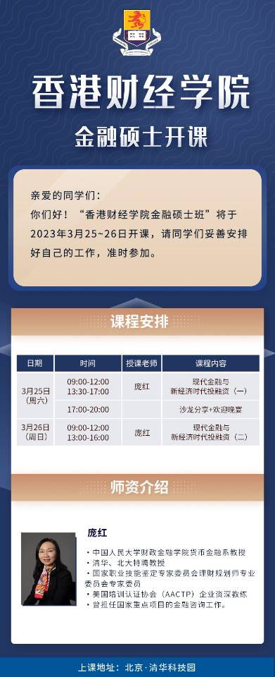 你們好!“香港財經(jīng)學(xué)院金融碩士班”將于2023年3月25~26日開課,請同學(xué)們妥善安排好自己的工作,準時參加。