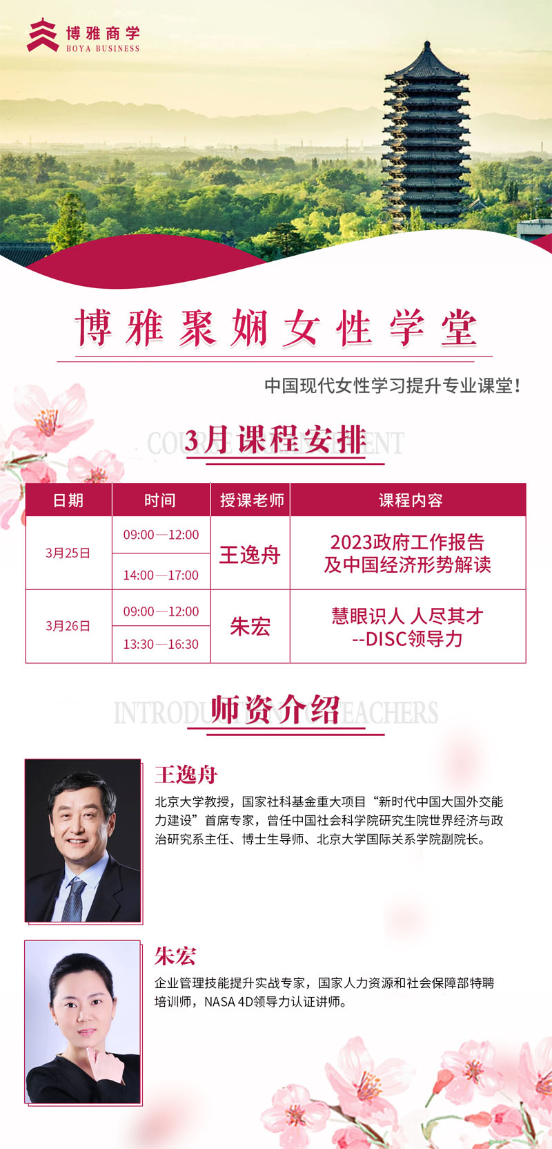 核心提示:博雅聚嫻女性學(xué)堂3月課程安排《博雅聚嫻女性學(xué)堂》專(zhuān)業(yè)致力于卓越女性的內(nèi)心修煉和魅力塑造。課程包括:魅力女性塑造篇、知性女性形成篇、職業(yè)女性提升篇、國(guó)學(xué)精粹與養(yǎng)生篇、家庭與生活篇、打