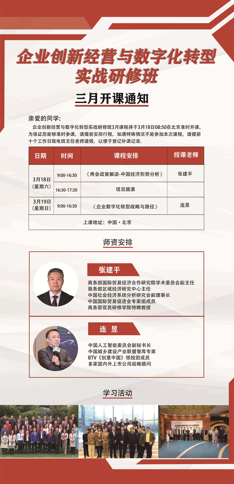 企業(yè)創(chuàng)新經(jīng)營與數(shù)字化轉(zhuǎn)型實戰(zhàn)研修班3月課程將于3月18日08:50在北京準(zhǔn)時開課為保證您能夠準(zhǔn)時參課,請?zhí)崆鞍才判谐?,如遇特殊情況不能參加本次課程,請?zhí)崆笆畟€工作日致電班主任老師請假,以便于登記補課記錄.