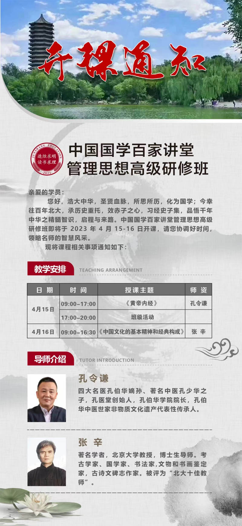 您好,浩大中華,圣賢血脈,所思所歷,化為國學;今幸往百年北大,承歷史重托,效赤子之心,習經(jīng)史子集,品悟干年中華之精髓智識,啟程與來路。中國國學百家講堂管理思想高級研修班即將于 2023年4月15-16 日開課,請您協(xié)調(diào)好時間,領(lǐng)略名師的智慧風采。
