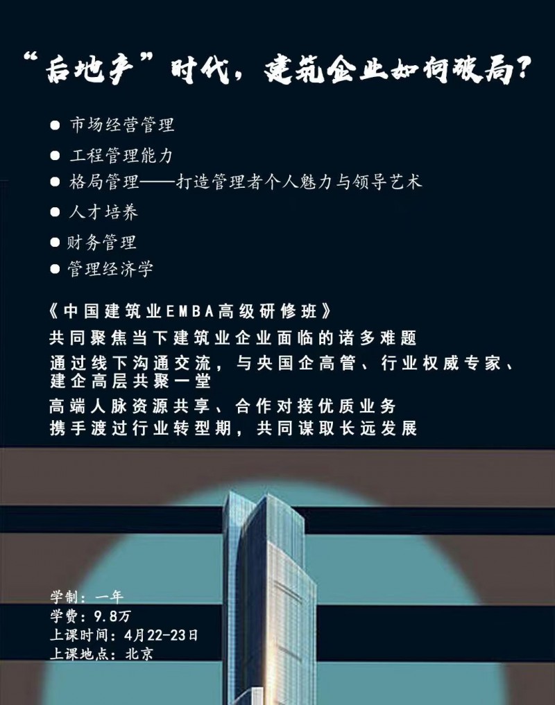 #中國建筑業(yè)EMBA高級研修班,共同聚焦當(dāng)下建筑業(yè)企業(yè)面臨的諸多難題,通過線下溝通交流,與央國企高管、行業(yè)權(quán)威專家、建企高層共聚一堂,高端人脈資源共享、合作對接優(yōu)質(zhì)業(yè)務(wù),攜手渡過行業(yè)轉(zhuǎn)型期,共同謀取長遠(yuǎn)發(fā)展。