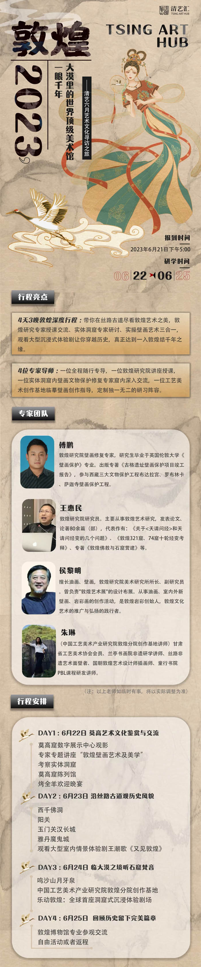 4位專家導(dǎo)師 :一位全程隨行專導(dǎo),一位敦煌研究院講座授課一位實(shí)體洞窟內(nèi)壁畫文物保護(hù)修復(fù)專家窟內(nèi)深入交流,一位工藝美術(shù)創(chuàng)作基地臨墓壁畫創(chuàng)作指導(dǎo),定制獨(dú)一無二的研習(xí)陣容。