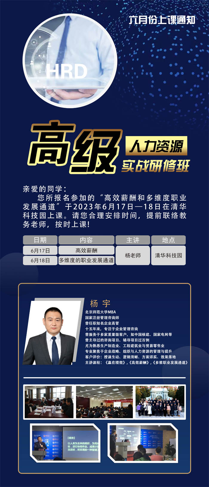核心提示:高級人力資源實戰(zhàn)研修班-2023年6月開課通知6月人力HRD實戰(zhàn)分享楊老師北京師范大學(xué)MBA/國家注冊管理咨詢師/曾任職知名企業(yè)高管十五年來,專注于企業(yè)管理咨詢;曾服務(wù)于多家重量級客戶,如中國核