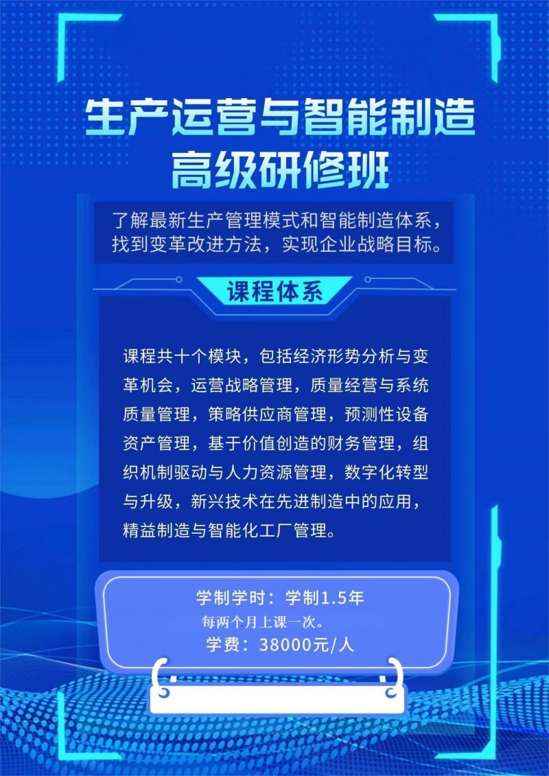 《生產(chǎn)運營與智能制造高級研修班》目前是培訓(xùn)市場一個專注于制造業(yè)主管生產(chǎn)負責(zé)人的長期培訓(xùn)課程。本班以課堂授課為主,不定期安排企業(yè)現(xiàn)場教學(xué),如前往北京現(xiàn)代、燕京啤酒、蒙牛集團、順鑫農(nóng)業(yè)、同仁堂等著名企業(yè)的生產(chǎn)一線參訪交流。本班時長1.5年,每兩個月上課一次,每次集中面授2天。培訓(xùn)費用:38000元/人。歡迎生產(chǎn)型企業(yè)的高管們報名參加!??!