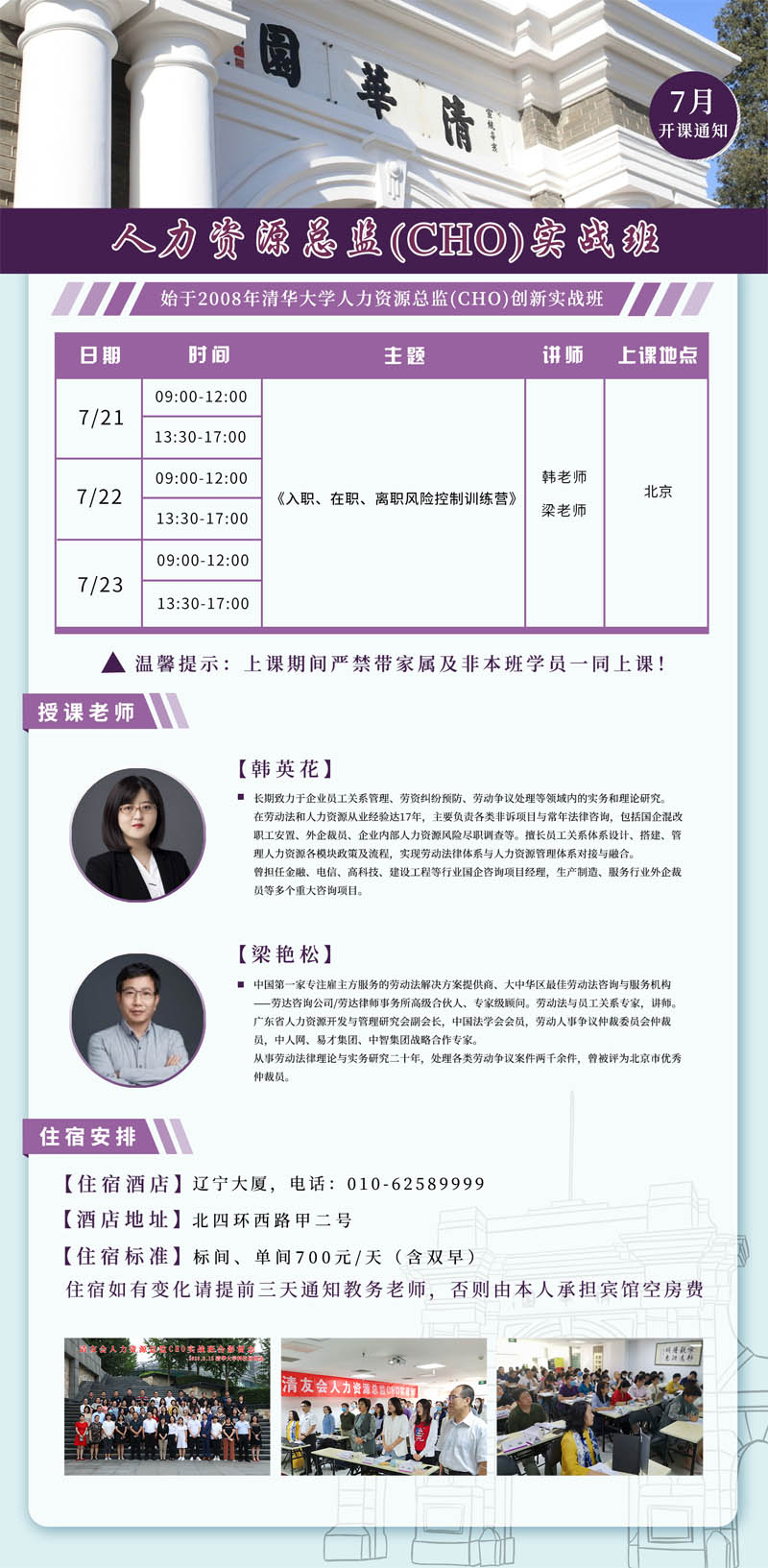 核心提示:上課時(shí)間:2023年7月21-23日課程主題:《入職、在職、離職風(fēng)險(xiǎn)控制訓(xùn)練營》班級名稱:人力資源總監(jiān)(CHO)實(shí)戰(zhàn)班老師介紹[韓英花]長期致力于企業(yè)員工關(guān)系管理、勞資糾紛預(yù)防、勞動(dòng)爭議處理等領(lǐng)域