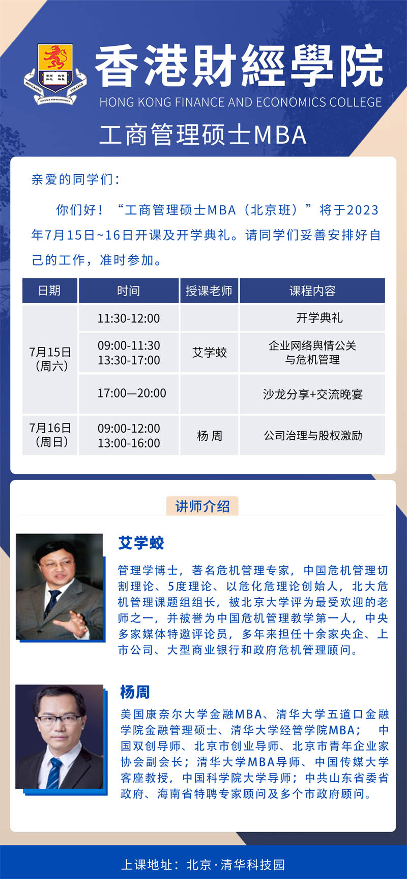 核心提示:香港財經(jīng)學院MBA-2023年7月課程安排親愛的同學們:你們好! “工商管理碩士MBA (北京班) ” 將于2023年7月15日~16日開課及開學典禮。請同學們妥善安排好自己的工作,準時參加。課程安排:7月15日