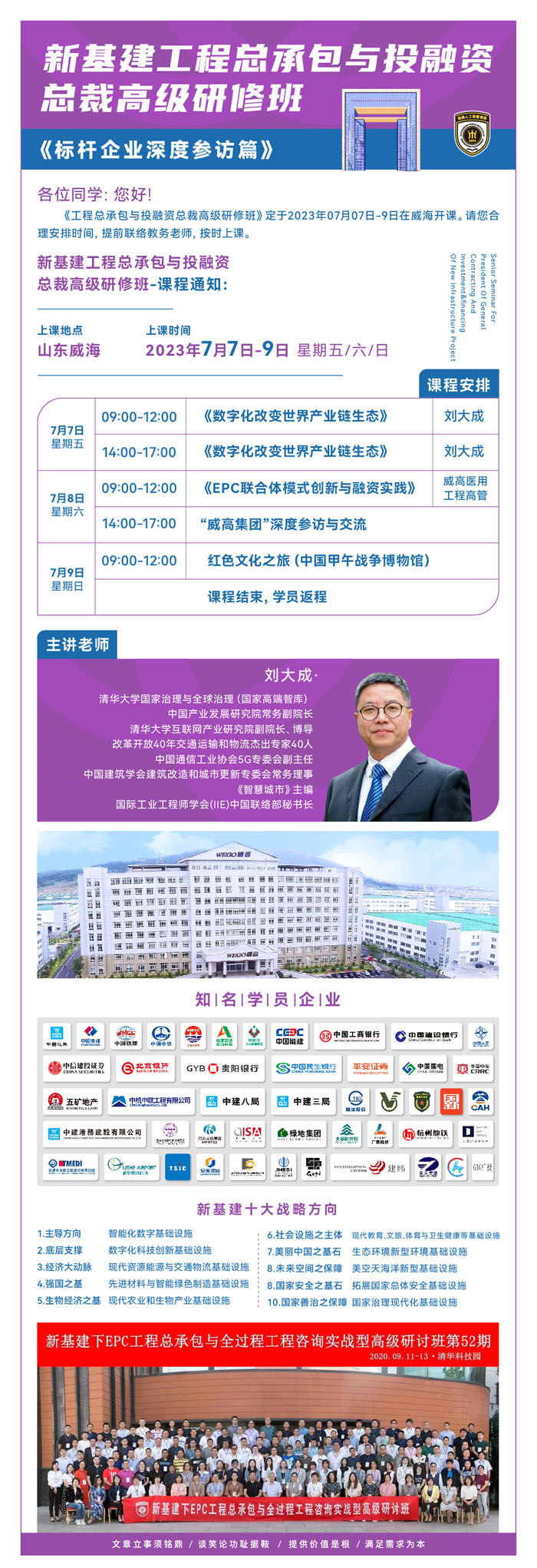 各位同學(xué): 您好!《工程總承包與投融資總裁高級研修班》定于2023年07月07日-9日在威海開課。請您合理安排時間,提前聯(lián)絡(luò)教務(wù)老師,按時上課
