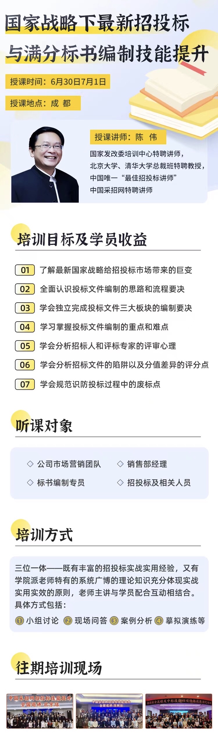 核心提示:授課時(shí)間:6月30日7月1日授課地點(diǎn):成 都授課講師:陳 偉國家發(fā)改委培訓(xùn)中心特聘講師北京大學(xué)、清華大學(xué)總裁班特聘教授中國唯一“最佳招投標(biāo)講師”中國采招網(wǎng)特聘講師培訓(xùn)目標(biāo)及學(xué)員收益了解最