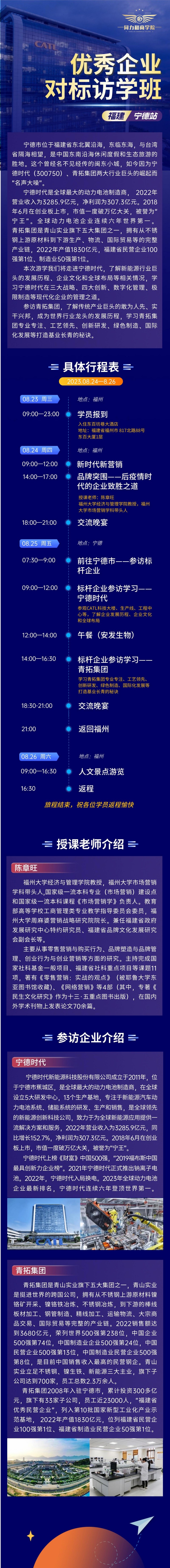 核心提示:【優(yōu)秀企業(yè)對(duì)標(biāo)訪學(xué)班】將于8月24日—8月26日在福建·福州舉行。請(qǐng)合理安排您的出行計(jì)劃,準(zhǔn)時(shí)前往。具體課程安排詳見課表。本次訪學(xué)我們將走進(jìn)兩大行業(yè)巨頭企業(yè)——寧德時(shí)代、青拓集團(tuán)。寧德時(shí)
