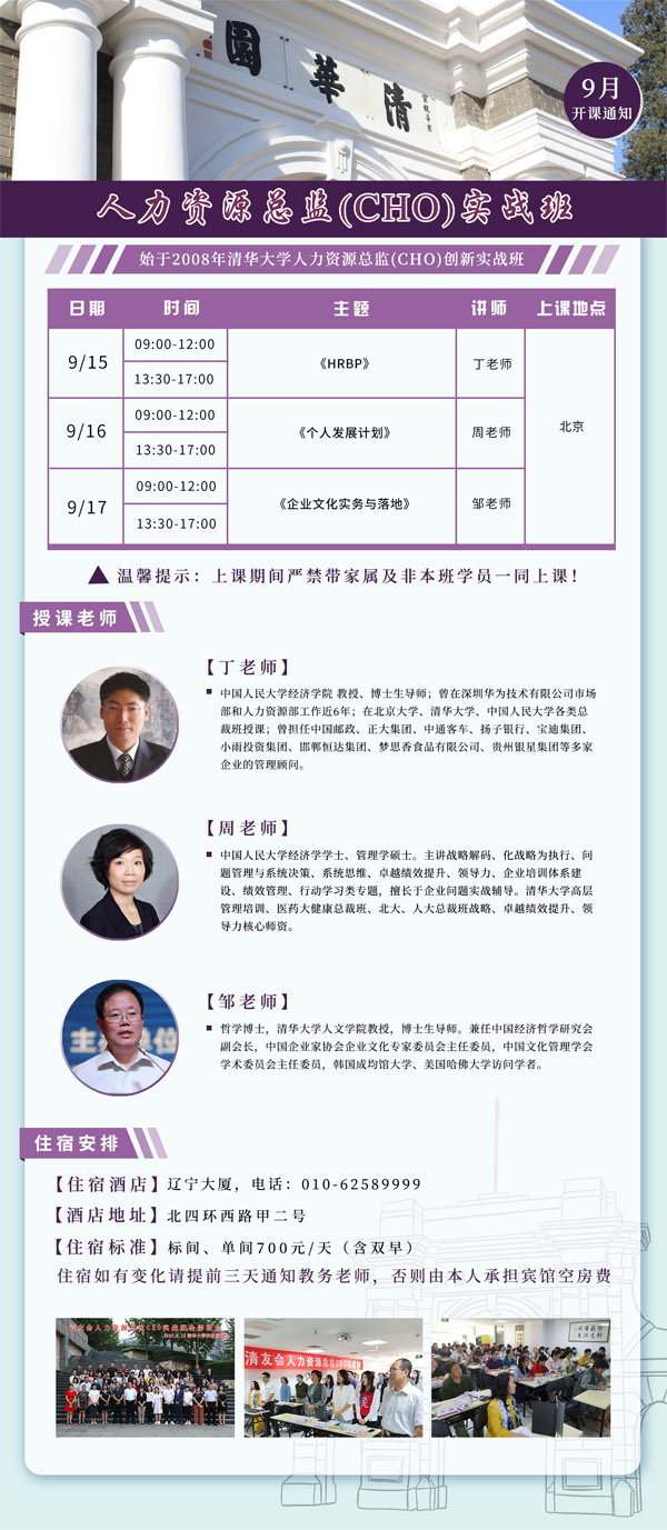 核心提示:【清友會(huì)課程安排】《人力資源總監(jiān)(CHO)實(shí)戰(zhàn)班》,費(fèi)用39800,學(xué)制一年半,每兩個(gè)月集中上課2-3天。上課時(shí)間:2023年9月15日-17日課程主題:《HRBP》《個(gè)人發(fā)展計(jì)劃》《企業(yè)文化實(shí)務(wù)與落地》[