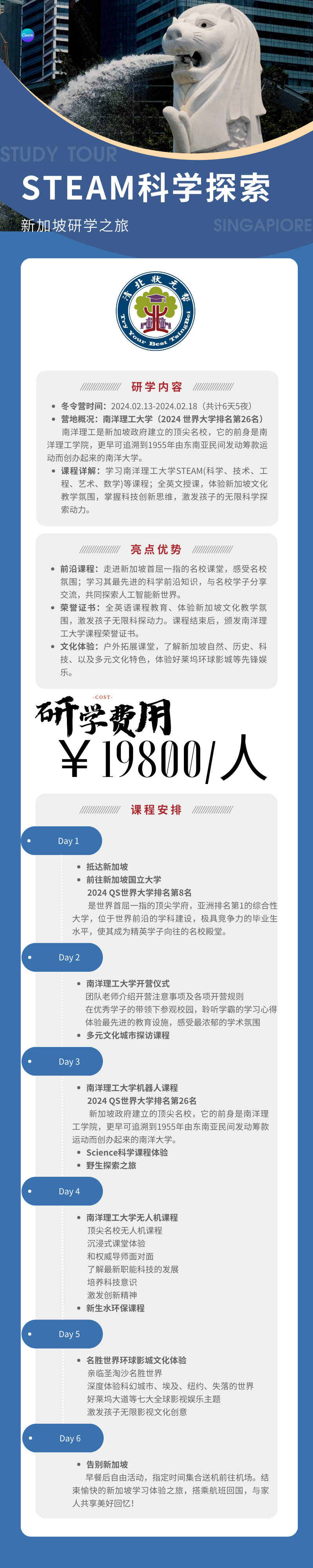 冬令營時(shí)間:2024.02.13-2024.02.18(共計(jì)6天5夜)營地概況:南洋理工大學(xué)(2024 世界大學(xué)排名第26名)南洋理工是新加坡政府建立的頂尖名校,它的前身是南洋理工學(xué)院,更早可追溯到1955年由東南亞民間發(fā)動(dòng)籌款運(yùn)動(dòng)而創(chuàng)辦起來的南洋大學(xué)。課程詳解:學(xué)習(xí)南洋理工大學(xué)STEAM(科學(xué)、技術(shù)、工.程、藝術(shù)、數(shù)學(xué))等課程;全英文授課,體驗(yàn)新加坡文化教學(xué)氛圍,掌握科技創(chuàng)新思維,激發(fā)孩子的無限科學(xué)探索動(dòng)力。