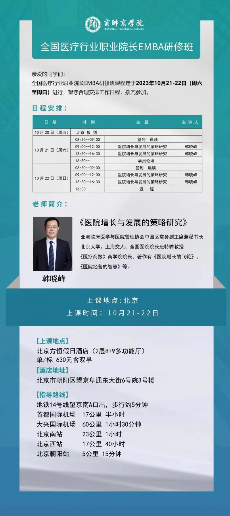 核心提示:親愛的同學(xué)們:全國醫(yī)療行業(yè)職業(yè)院長EMBA研修班課程定于2023年10月21-22日(周六至周日)進(jìn)行,望您合理安排工作日程,撥冗參加。授課老師:韓曉峰亞洲臨床醫(yī)學(xué)與醫(yī)院管理協(xié)會中國區(qū)常務(wù)副主席兼秘