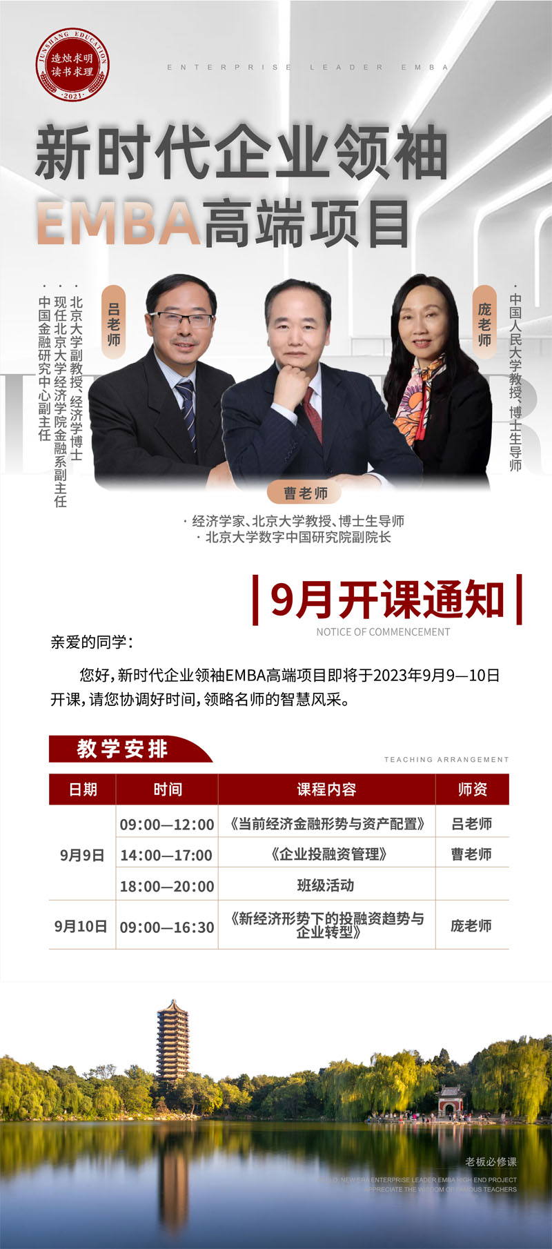 新時代企業(yè)領(lǐng)袖EMBA高端項目2023年9月課程安排通知
