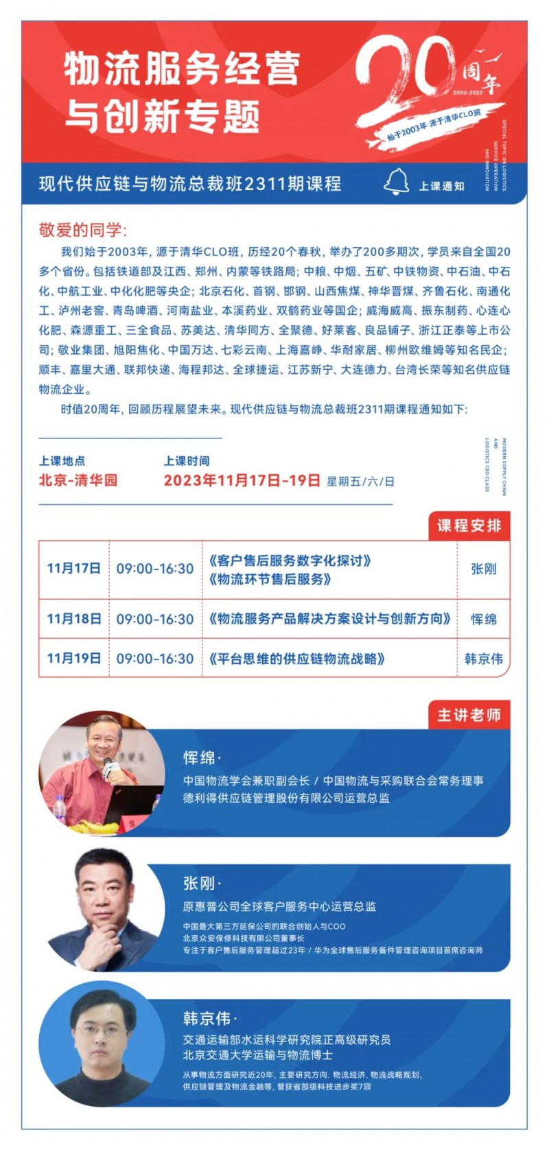 歷經(jīng)19年打造,從“清華大學(xué)現(xiàn)代物流經(jīng)理CLO高研班”升級為“現(xiàn)代供應(yīng)鏈與物流總裁高級研修班”。建設(shè)了國內(nèi)頂尖50名專家?guī)?;匯聚了全國300名大型制造業(yè)高管,其中100億級以上30多家;匯聚了全國500名大型物流企業(yè)董事長,其中全國性物流企業(yè)20多家。