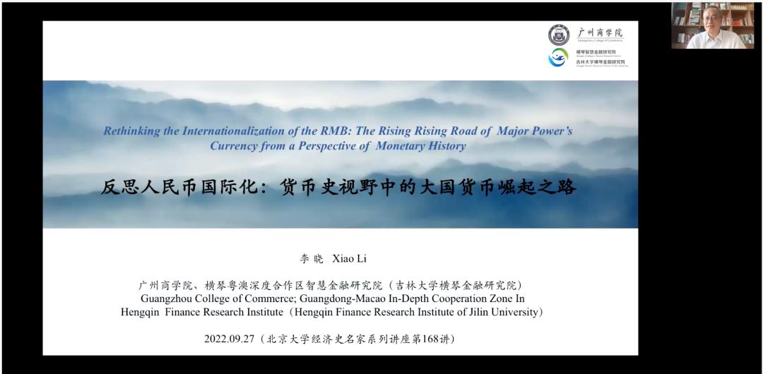 2022年9月30日,北大經(jīng)濟史學(xué)名家系列講座第168講“反思人民幣國際化:貨幣史視野中的大國貨幣崛起之路”通過騰訊會議形式舉辦,共三百余人參加。講座由北京大學(xué)經(jīng)濟學(xué)院經(jīng)濟史學(xué)系、北京大學(xué)經(jīng)濟學(xué)院社會經(jīng)濟研究所、北京大學(xué)外國經(jīng)濟學(xué)說研究中心聯(lián)合主辦。吉林大學(xué)“匡亞明學(xué)者”卓越教授、廣州商學(xué)院名譽校長、教育部“長江學(xué)者”特聘教授李曉擔(dān)任主講人,北京大學(xué)經(jīng)濟學(xué)院教授趙留彥擔(dān)任主持人,中國人民大學(xué)財政金融學(xué)院教授何平,北京師范大學(xué)經(jīng)濟與管理學(xué)院副教授賀力平擔(dān)任與談人。