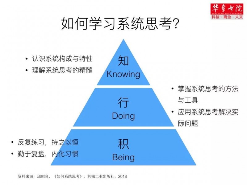 那么,如何學(xué)習(xí)系統(tǒng)思考呢?經(jīng)過我的梳理,借鑒荀子倡導(dǎo)的“知”“行”“積”,我提出了一個(gè)學(xué)習(xí)系統(tǒng)思考的三階段模型: