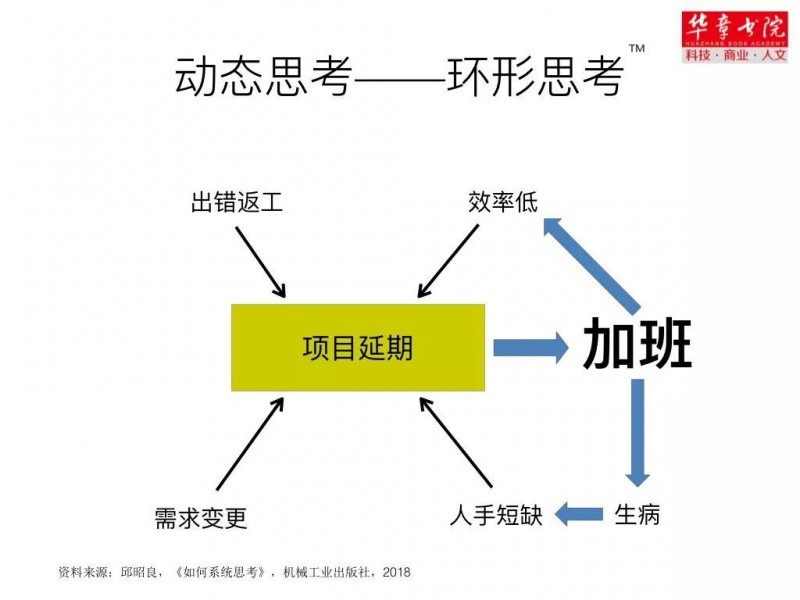 但是,我們要想學(xué)會系統(tǒng)思考,必須要實(shí)現(xiàn)思考的升維,也就是要增加一個(gè)思考的維度:不要僅僅停留在單一的從原因到結(jié)果的這樣一個(gè)維度。我們要思考因果的動(dòng)態(tài)性,也就是:項(xiàng)目延期會帶來什么樣的后果,或者產(chǎn)生什么樣的影響?