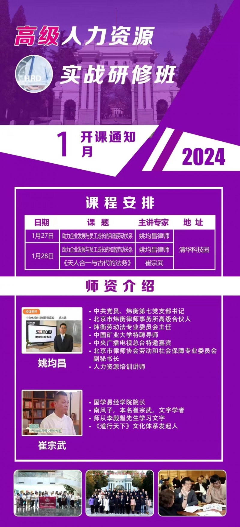 核心提示:高級(jí)人力資源總監(jiān)實(shí)戰(zhàn)研修培訓(xùn)班開課時(shí)間:2024年1月27-28日授課主題:助力企業(yè)發(fā)展與員工成長的和諧勞動(dòng)關(guān)系 、《天人合一與古代的法務(wù)》授課老師:姚均昌律師、崔宗武高級(jí)人力資源總監(jiān)實(shí)戰(zhàn)研