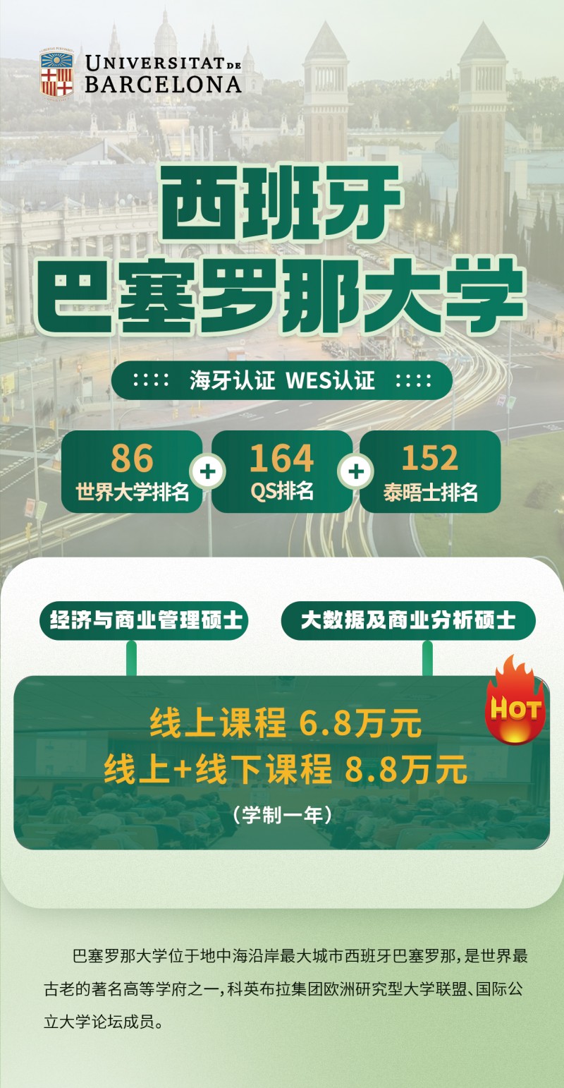核心提示:不出國、在職讀世?名界?校碩士~【西班牙巴?羅塞?那大學(xué)(世?大界?學(xué)排名86,QS排名164,西班牙排名第一的大學(xué))】2024級正在招生~ 錄取50人,額滿封班!1、線上學(xué)費6.8萬元2、線上+線下