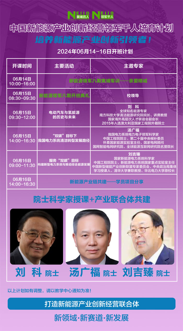 核心提示:2024新能源,新發(fā)展——?dú)g迎走進(jìn)《中國(guó)新能源產(chǎn)業(yè)創(chuàng)新經(jīng)營(yíng)(領(lǐng)軍千人)培育計(jì)劃》,在細(xì)處求精益,在寬處謀布局,在高處學(xué)獨(dú)到!領(lǐng)軍八期6月14-16日啟動(dòng)新一輪課程。這是一個(gè)匯集頂尖院士、學(xué)者