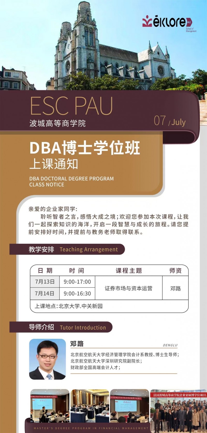 核心提示:法國波城高等商學(xué)院DBA博士學(xué)位班| 7月課程通知“圓一個(gè)夢,學(xué)一次習(xí),交一群友” !重返校園,聆聽智者洞見,開始人生新征程為了您科學(xué)管理時(shí)間,合理安排報(bào)到學(xué)習(xí)事宜,請及時(shí)關(guān)注如下事項(xiàng):