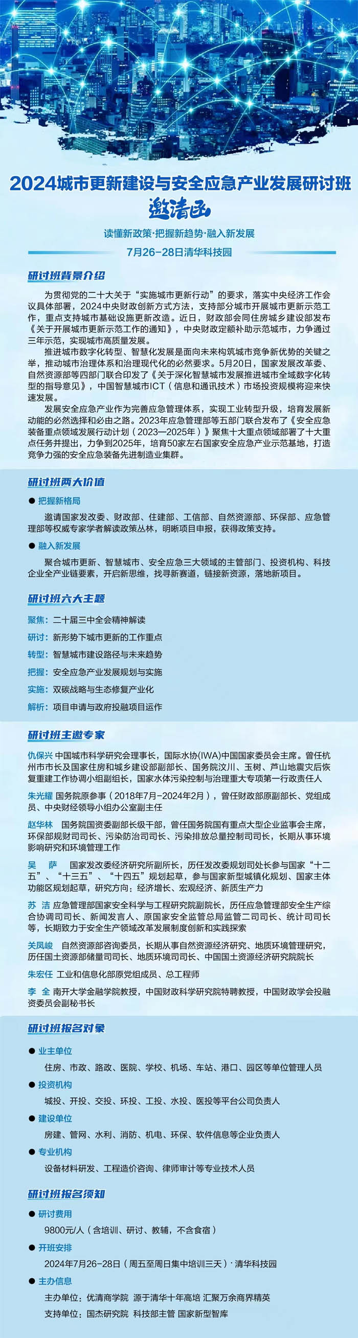 近日在國家發(fā)改委、住建部、財政部、應(yīng)急管理部、自然資源部等多部委重點(diǎn)部署及財政政策支持下,★我國城市更新、★智慧城市建設(shè)、★安全應(yīng)急產(chǎn)業(yè)將迎來巨大發(fā)展機(jī)遇。學(xué)院會同國家新型智庫及時組織相關(guān)部委專家學(xué)者,于7月26-28日在清華科技園舉辦★《2024城市更新建設(shè)與安全應(yīng)急產(chǎn)業(yè)發(fā)展研討班》,助力相關(guān)主管單位、業(yè)主單位、投建企業(yè)、設(shè)備研發(fā)、材料研發(fā)、信息技術(shù)、工程咨詢企業(yè)負(fù)責(zé)人★解讀政策叢林、★明晰項目申報、★獲得政策支持,聚焦三中全會、聚齊發(fā)展要素、開啟新思維、鏈接新資源、落地新項目、★實現(xiàn)新發(fā)展、特邀您參加!