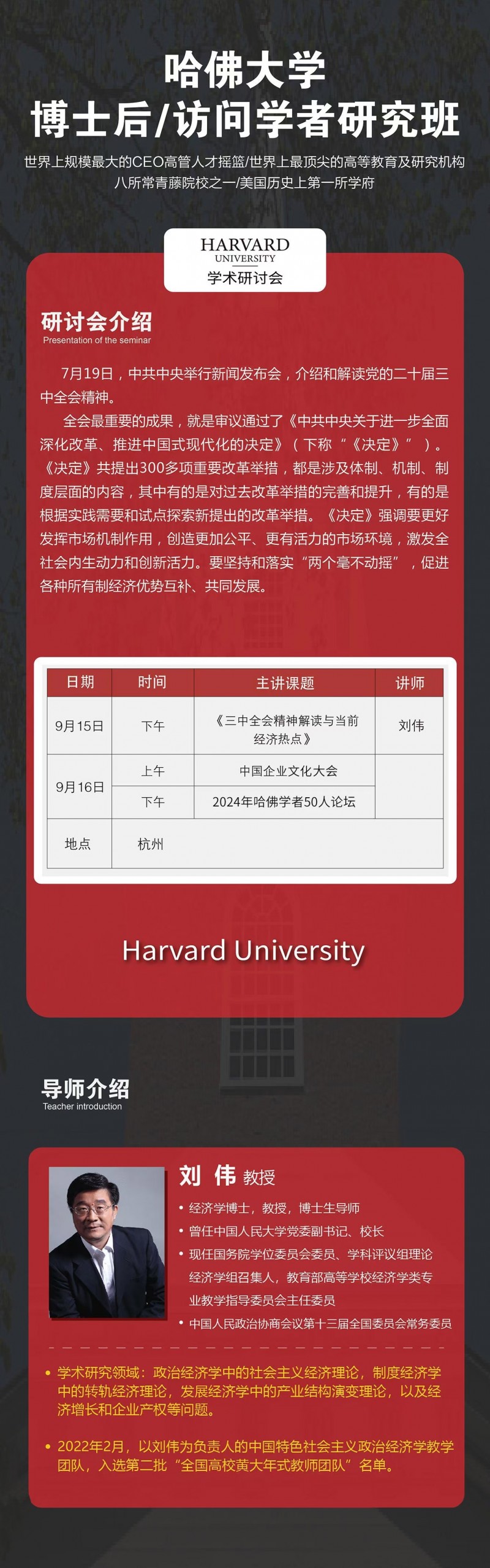 哈佛大學(xué)博士后研究班2024年9月開課通知 杭州研討會(huì)