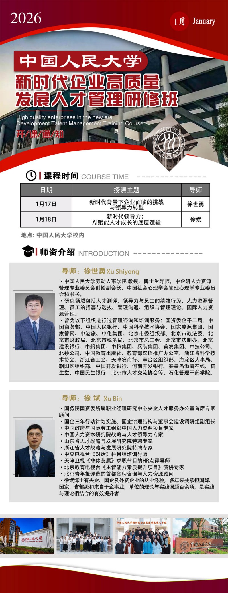中國人民大學「新時代企業(yè)高質量發(fā)展人才管理研修班」1月17-18日校內開課!